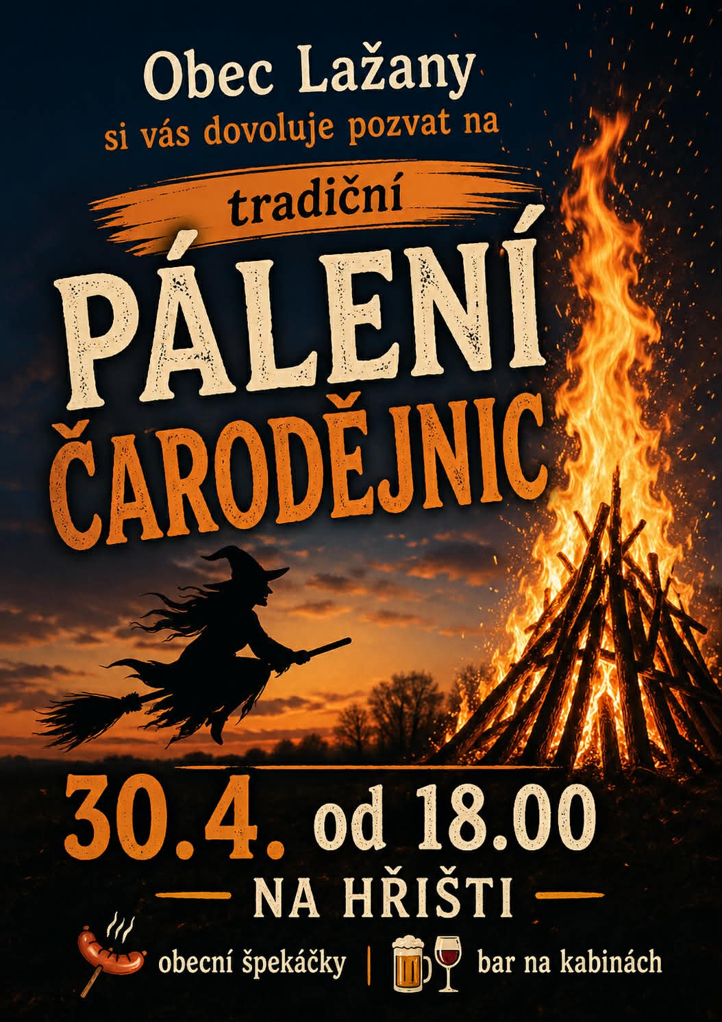 Pálení čarodějnic 28.4.2026 Sdílet Sdílet Klikněte pro zkopírování URL Facebook Obec Lažany Vás zve na tradiční pálení čarodějnic, které se uskuteční 30.4. od 18:00 na místním hřišti. Obecní špekáčky, bar na kabinách v provozu.